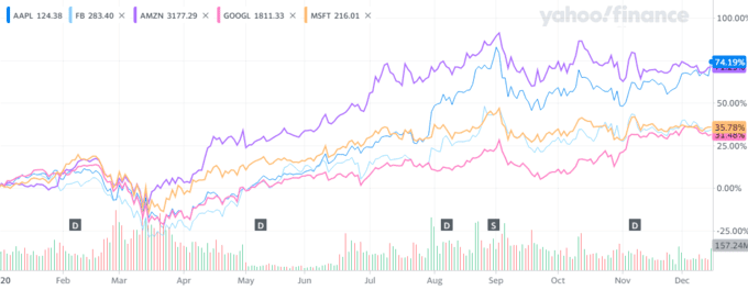 Cổ phiếu tăng vọt giúp vốn hóa của Apple, Alphabet, Microsoft và Amazon vượt 1.000 tỷ USD. Apple cũng là công ty đầu tiên có giá trị thị trường trên 2.000 tỷ USD. Cổ phiếu Netflix, Tesla, Square, PayPal, Nvidia và Adobe đều lập đỉnh năm nay. Các mã khác hưởng lợi lớn từ lệnh phong tỏa, như Zoom Video hay Slack cũng tăng giá mạnh.