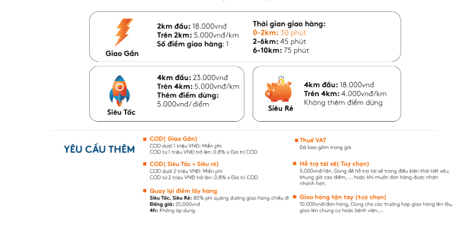 Dịch vụ giao hàng nội thành hàng đầu với đa dạng các gói: Siêu Tốc, Siêu Rẻ, Trong Ngày, Đồng Giá 25 giúp bạn đặt giao hàng nhanh chóng, đơn giản khắp Hà Nội và TP.HCM.